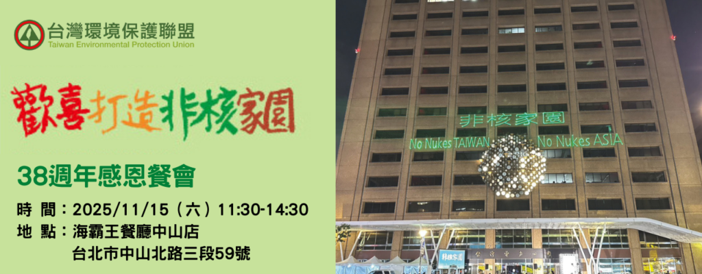 台灣環保聯盟今年38歲了,感謝您的一路相挺。我們將於11月15日(星期六)中午11:30假台北市海霸王餐廳(中山店)舉辦慶祝環盟38週年感恩餐會。誠摯邀請您撥冗出席,共襄盛舉。