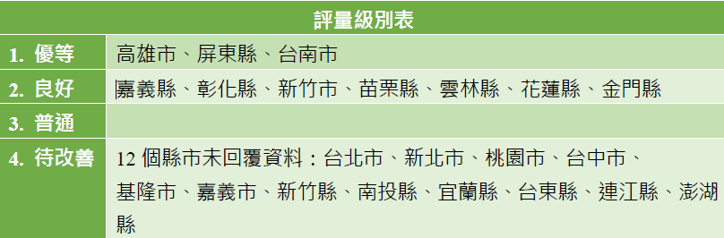 - 12個縣市不回覆資料:台北市、新北市、桃園市、台中市、基隆市、嘉義市、新竹縣、宜蘭縣、台東縣、南投縣、澎湖縣、連江縣