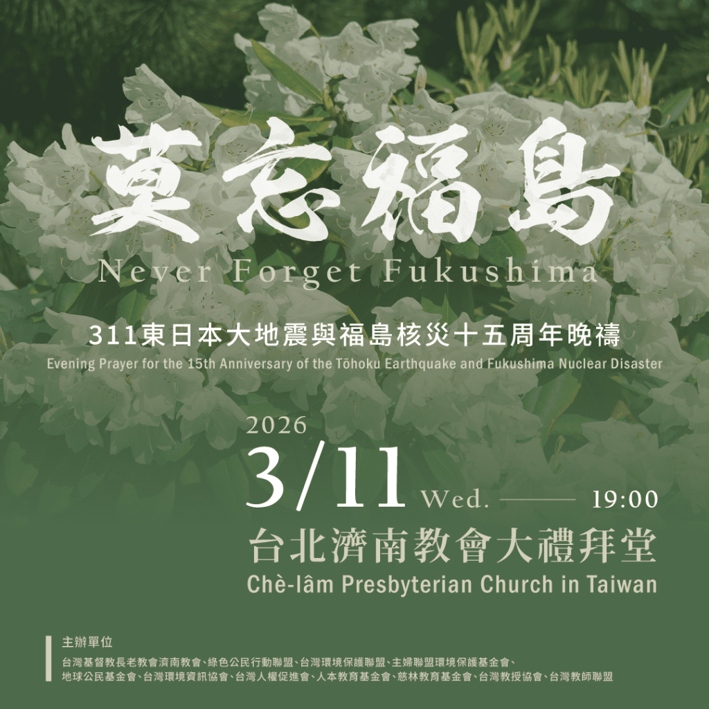 在15週年的這一天,台灣的民間團體發起為311祈禱的晚會,共同紀念這場不應被遺忘的災難,希望透過祈禱、點燭與靜默行動,為所有在地震、海嘯與核災中受苦的人們獻上追思與祝禱,紀念逝去的生命,也陪伴仍在苦難中的人們,為他們的家園與健康祈福,並祈願災後的重生與安全的未來。